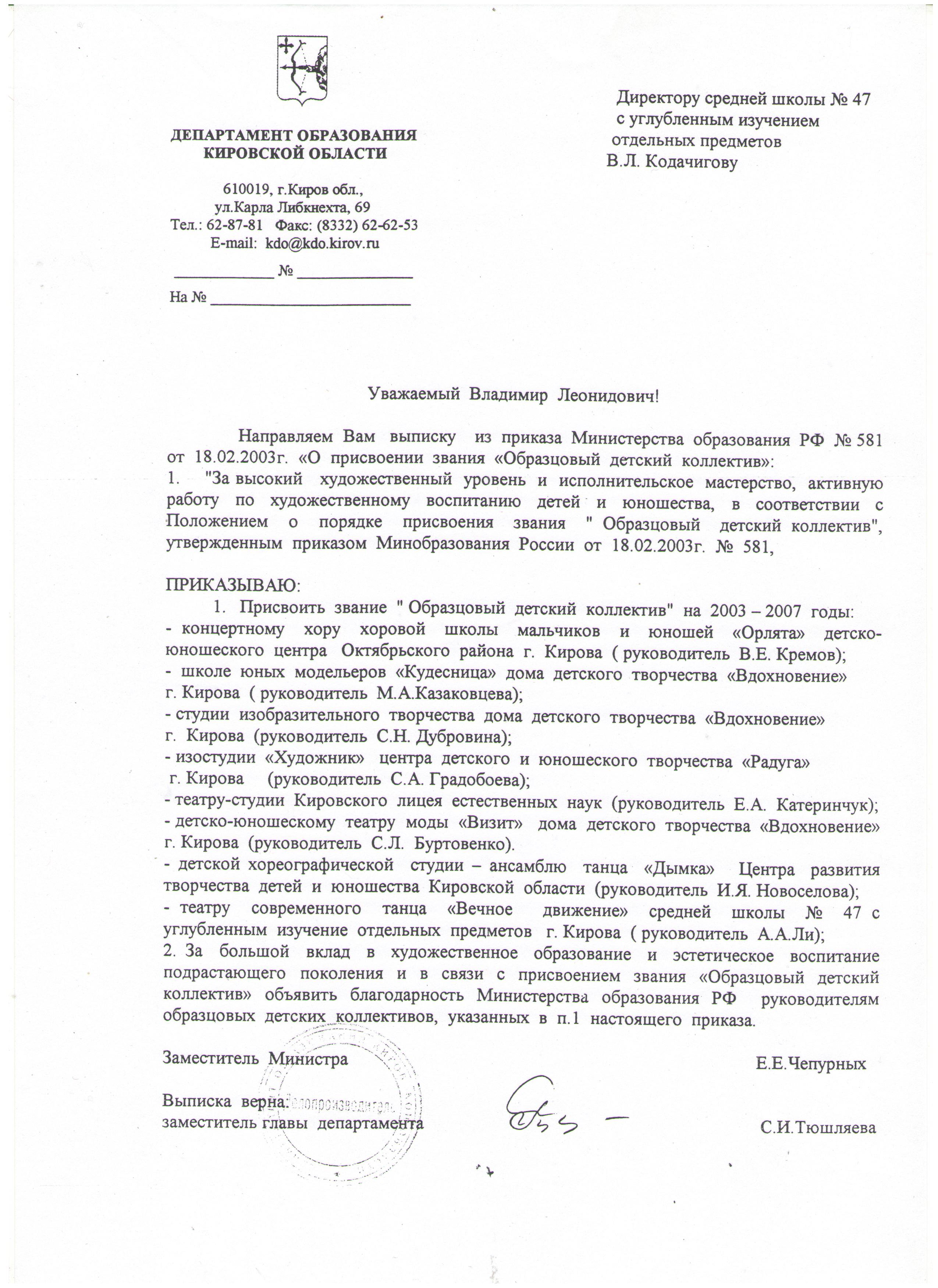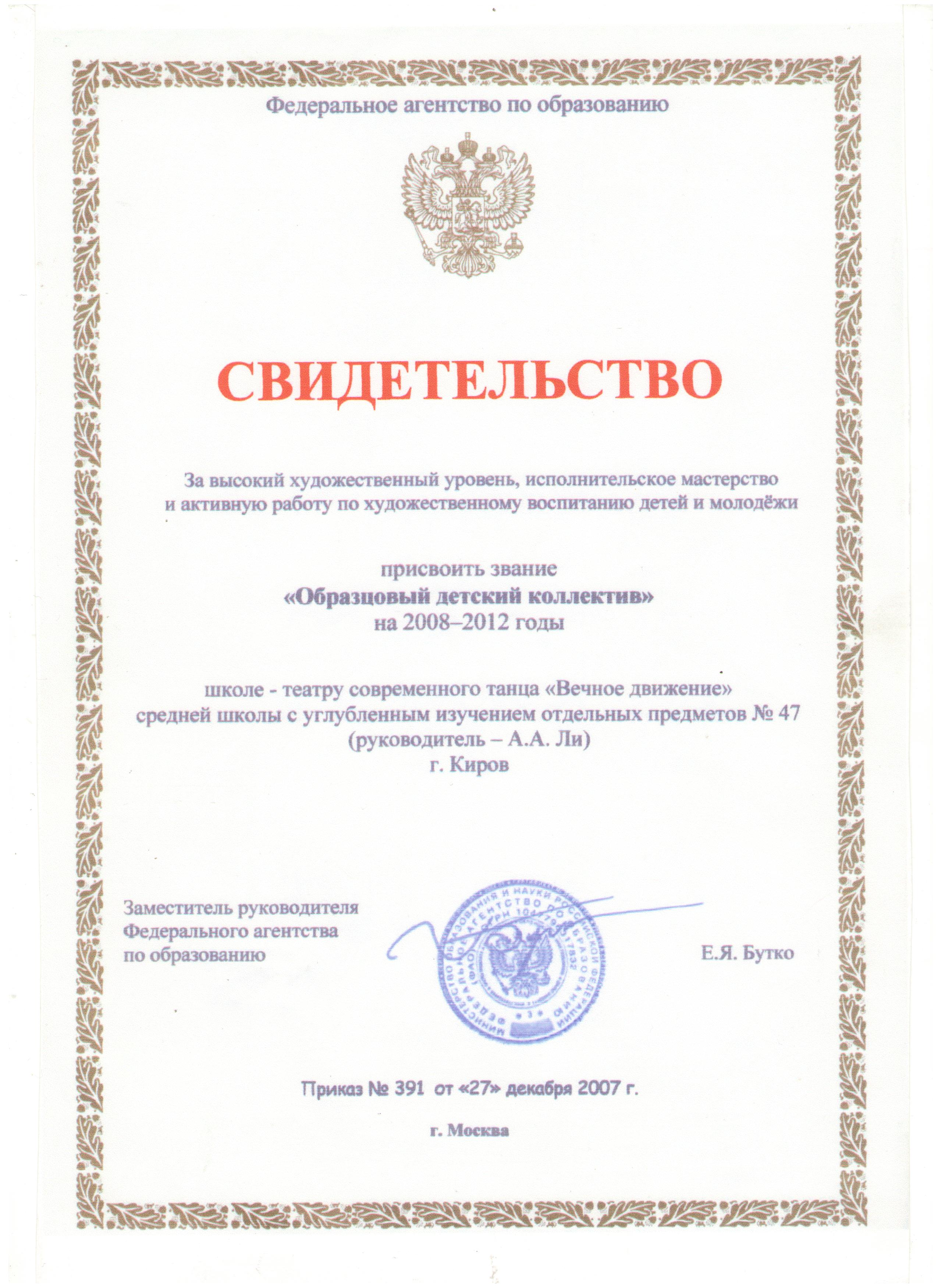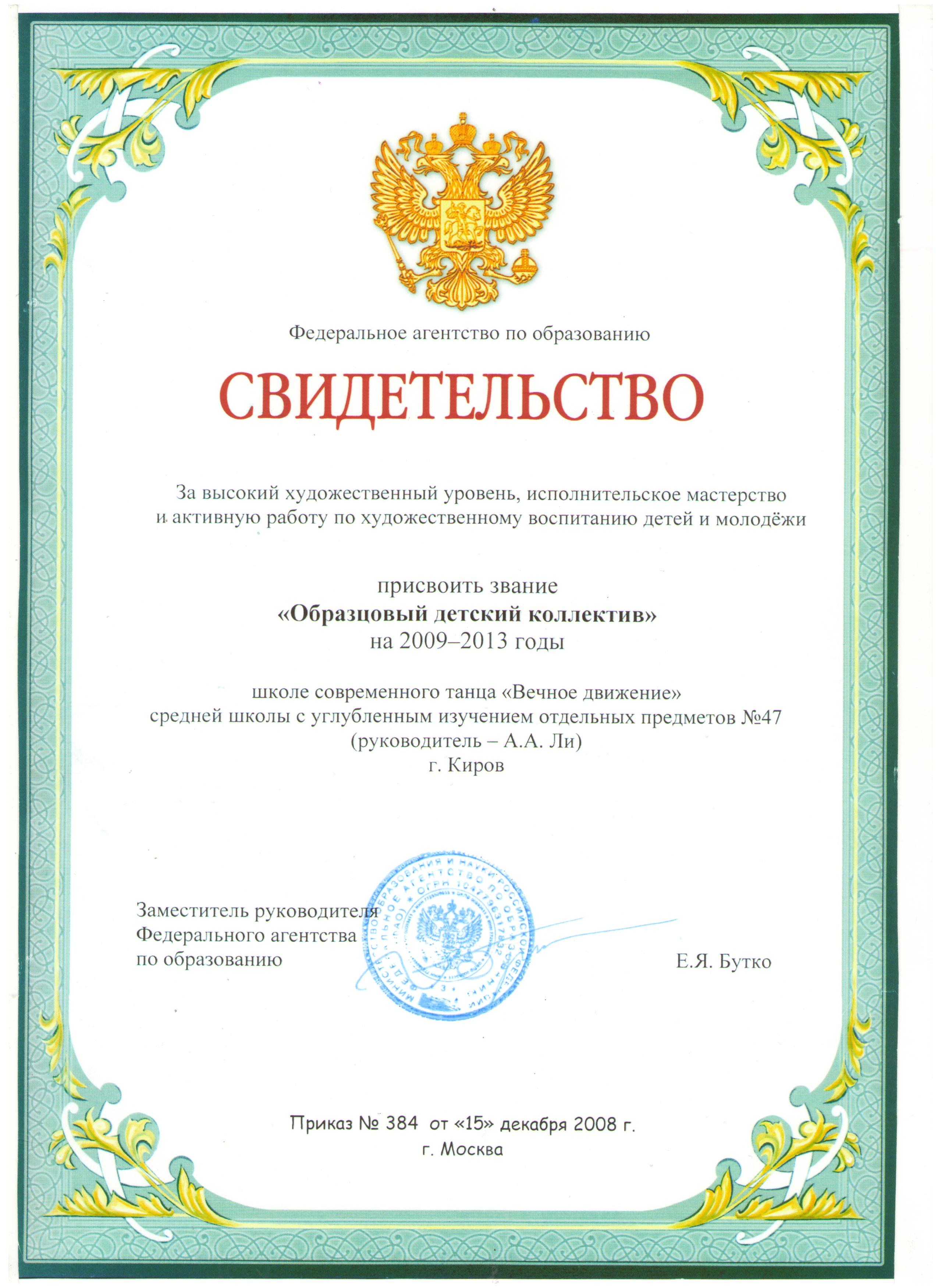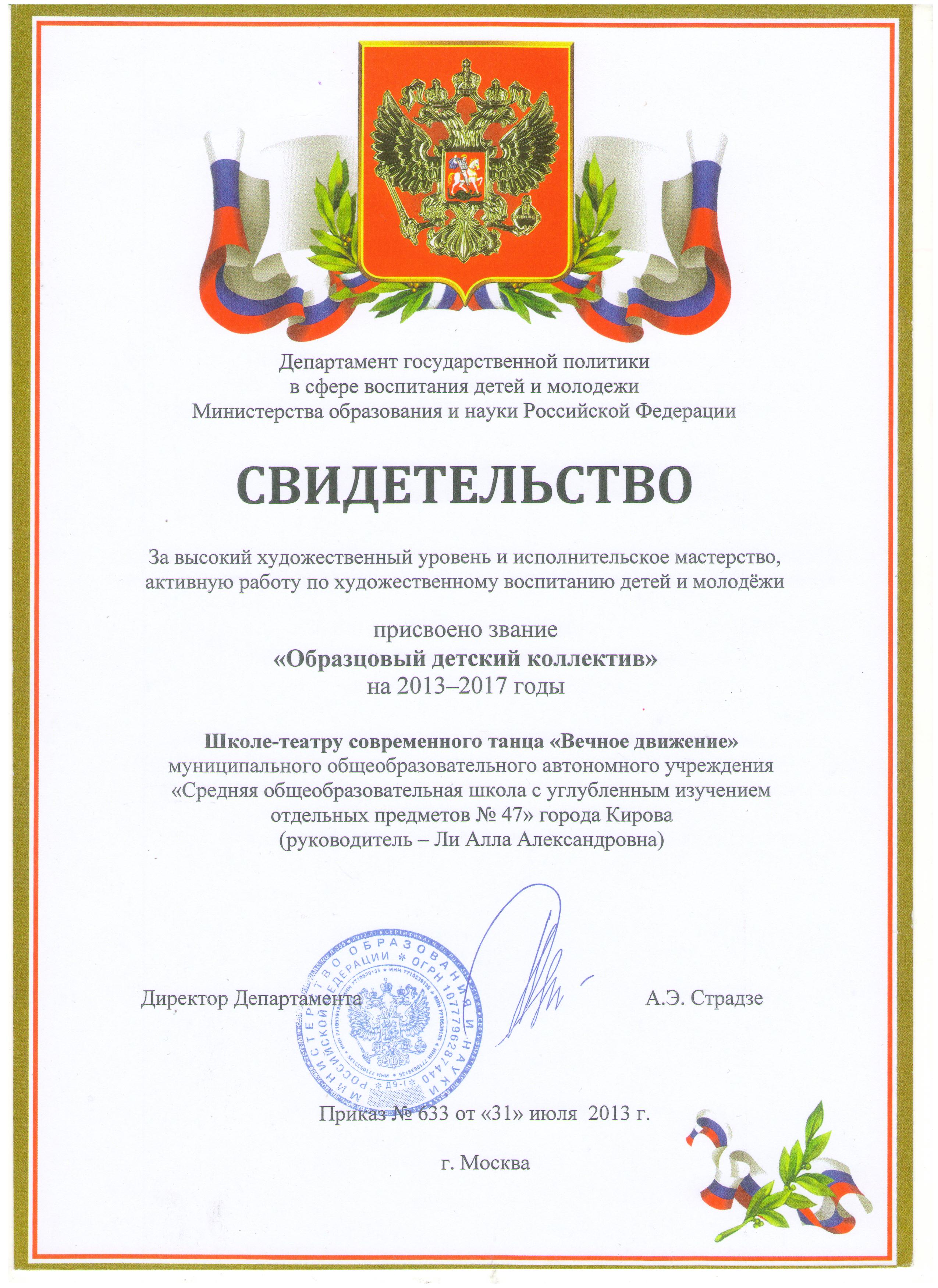 За высокие достижения в области образования и художественно - эстетического воспитания детей, юношества и молодежи города школе современного танца «Вечное движение» было присвоено почетное Звание «Образцовый детский коллектив»: