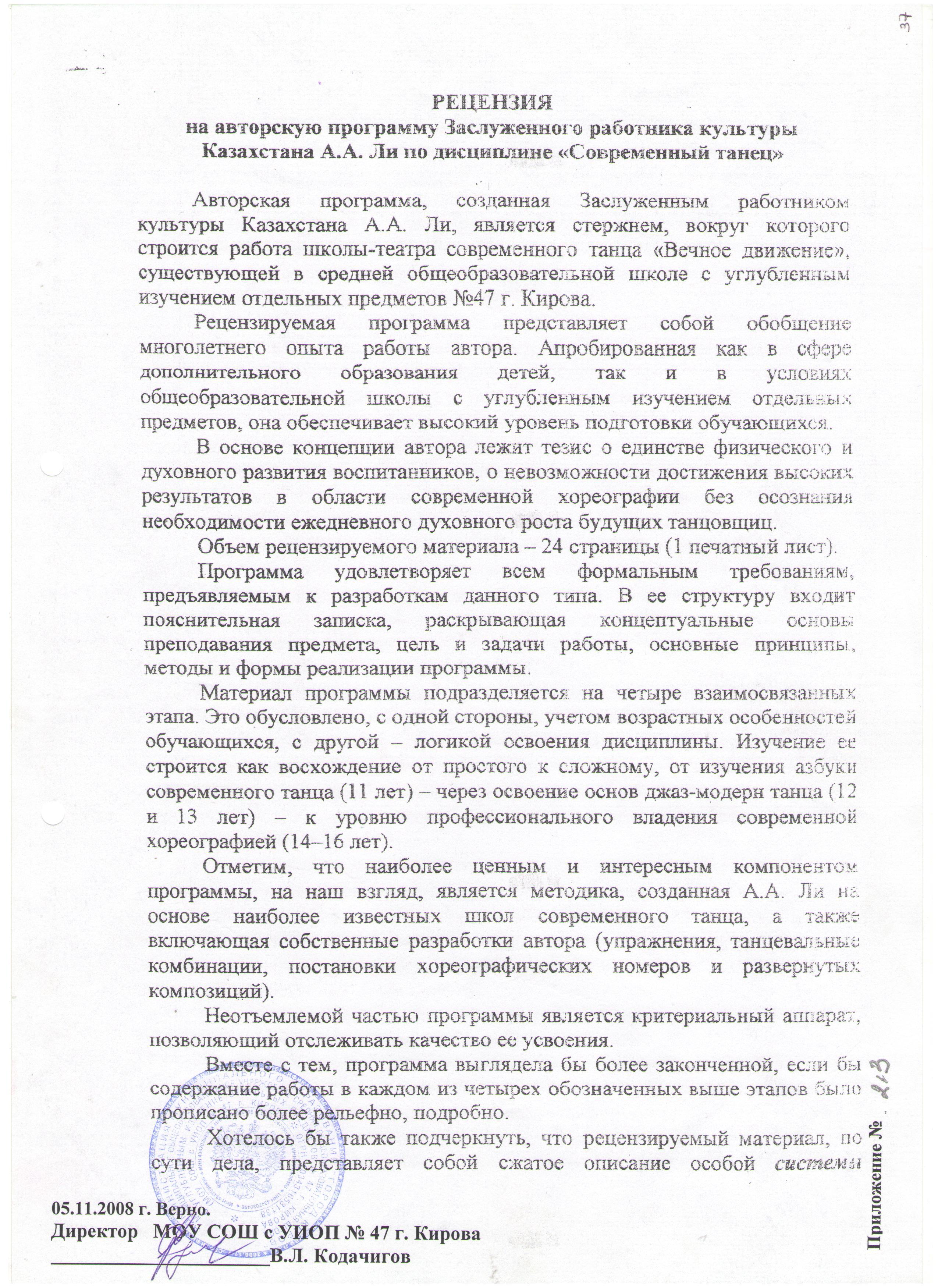 В 1997 г. при доме творчества юных «Вдохновение» г. Кирова было создано отделение современного танца. В августе 2001 г. распоряжением мэра г. Кирова коллектив был переведён в Муниципальное общеобразовательное автономное учреждение «Среднюю общеобразовательную школу с углубленным изучением отдельных предметов № 47» города Кирова, где была создана школа современного танца «Вечное движение» со сроком обучения на 9 лет и дальнейшим получением профессиональной квалификации по окончании 5 летнего обучения в Мастер-классе под руководством художественного руководителя, балетмейстера- постановщика Заслуженного работника культуры Казахстана, Заслуженного работника культуры Кировской области, Почетного работника общего образования РФ, обладателя Золотой медали и Золотого кубка Международного Чемпионата по хореографическому искусству в г. Москве, 11-кратного обладателя Гран-При Международных конкурсов и фестивалей, Дипломанта ЮНЕСКО, Дипломанта XXII Олимпийских Зимних игр 2014 г. в г. Сочи, педагога высшей категории Аллы Александровны Ли. (Лицензия, рецензия)